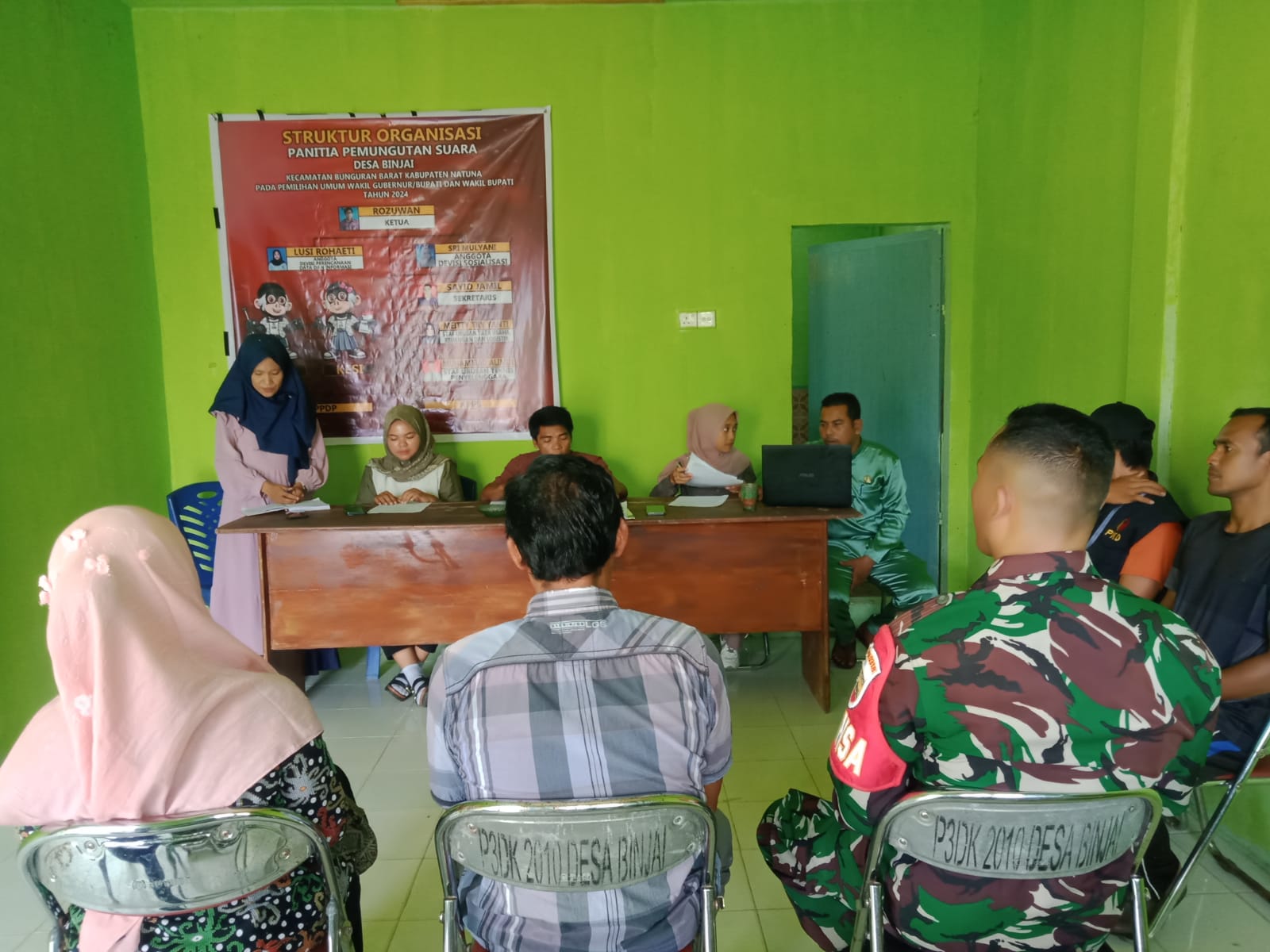 Binjai, 06 September 2024- Pada hari Jum’at tepatnya tanggal 06 September 2024, PPS Desa Binjai telah melaksanakan kegiatan Pleno Terbuka Daftar Pemilih Sementara Hasil Perbaikan (DPSHP) Tingkat Desa. Acara yang dilaksanakan di Sekretariat PPS Desa Binjai tersebut dihadiri oleh Kasi Pemerintahan Desa Binjai sebagai Perwakilan dari Kepala Desa, PKD Desa Binjai, Bhabinkamtibmas, Babinsa, Staf KPU Kabupaten Natuna, RT dan RW Se-Desa BinjaiBerdasarkan Hasil dari Pleno tersebut, berdasarkan dengan data yang disampaikan oleh Ketua PPS Selaku Pimpinan Pada Pleno tersebut, Total Pemilih Sementara Hasil Perbaikan Desa Binjai adalah 569 Pemilih.